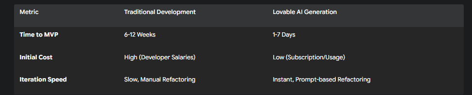 Lovable’s instant generation crushes the weeks required for traditional builds. This shift offers lower maintenance and helps companies save time and costs, leading to much faster business growth with AI. AI is truly redefining what "quality" means, prioritizing functional, secure, and rapidly deployed products.
